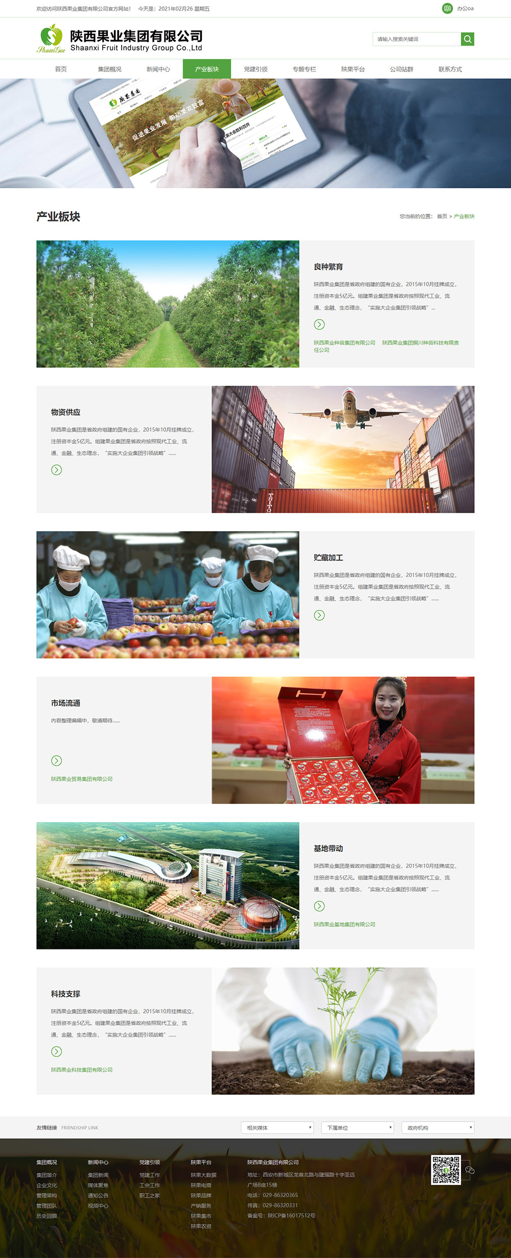 陜西果業(yè)集團是省政府組建的國有企業(yè),2015年10月掛牌成立,注冊資本金5億元。組建陜果集團是省政府按照現代工業(yè)、流通、金融、生態(tài)理念,“實(shí)施大企業(yè)集團引領(lǐng)戰略”,推動(dòng)我省果業(yè)轉型升級,實(shí)現由果業(yè)大省向果業(yè)強省轉變的一項重要舉措。