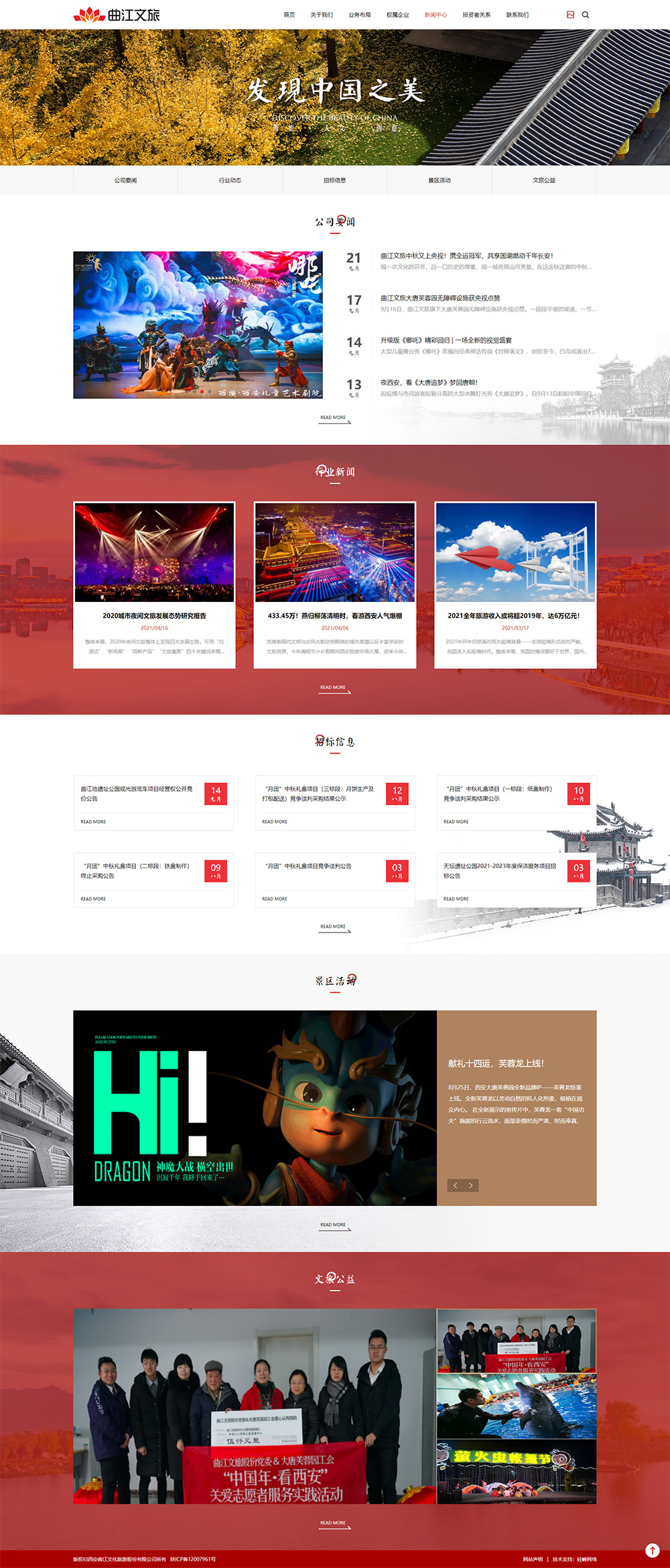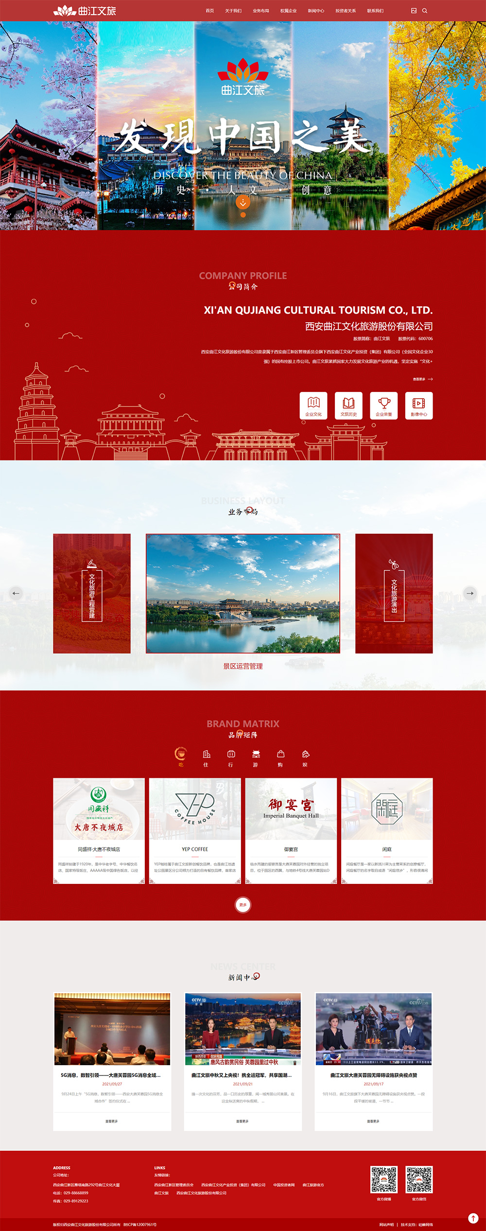 西安曲江文化旅游股份有限公司是隸屬于西安曲江新區管理委員會(huì )旗下西安曲江文化產(chǎn)業(yè)投資(集團)有限公司(全國文化企業(yè)30強)的國有控股上市公司。曲江文旅緊抓國家大力發(fā)展文化旅游產(chǎn)業(yè)的機遇,堅定實(shí)施“文化+”“旅游+”戰略,立足西安,放眼全國,構建了文化旅游全產(chǎn)業(yè)鏈條集成運營(yíng)發(fā)展平臺,是涵蓋文化旅游“策、規、投、建、營(yíng)“于一體的中國文化旅游集成運營(yíng)商。