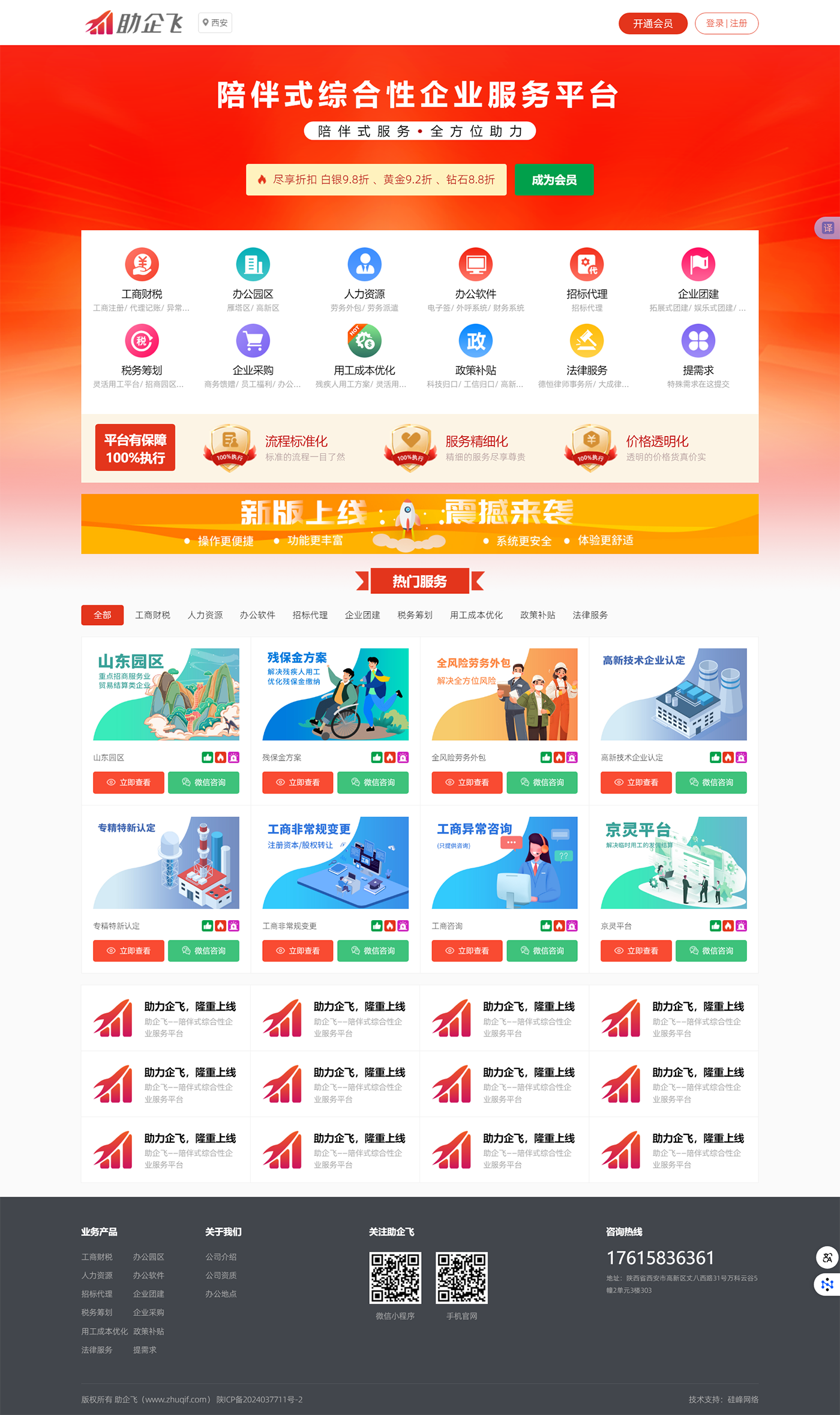 助企飛——陪伴式綜合性企業(yè)服務(wù)平臺定位于服務(wù)中小企業(yè)客戶(hù),為中小企業(yè)主提供12大類(lèi)100多種企業(yè)服務(wù)產(chǎn)品,一站式滿(mǎn)足企業(yè)多種需求,陪伴式服務(wù)到底。降低企業(yè)選擇成本,提高企業(yè)需求響應,增強企業(yè)服務(wù)體驗。我們承諾流程標準化——標準的流程一目了然;服務(wù)精細化——精細的服務(wù)盡享尊貴;價(jià)格透明化——透明的價(jià)格貨真價(jià)實(shí)。